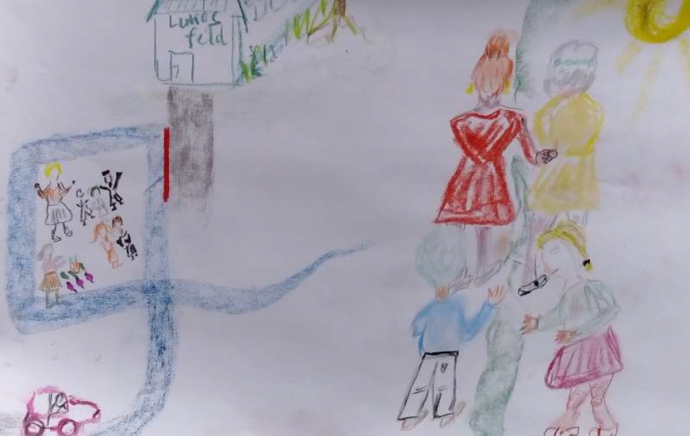 Nach dem Gespräch über den Traum und die daraus aufkommenden Gefühle und Gedanken wendet sich Iris dem leeren Blatt auf dem Tisch zu, berührt es mit geschlossenen Augen, mit beiden Händen, dann mit Kreidestiften in beiden Händen.