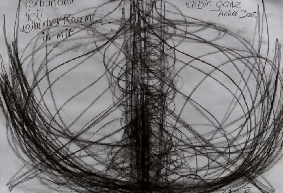 Wieder gibt es eine starke Mittelachse, um die sich Spiralbewegungen auf und ab schlängeln. Nun wird die Achse durch eine große Bodenschale ergänzt, was im Anschauen zum Boot und zugleich zum Anker wird. Das Boot ist Symbol des Getragenseins auf den Wellen des großen Lebenswassers, geborgen und geschützt - der Anker haft auf Erden, da ist das Schiff an Land....- die Mittelachse ist verankert zwischen Erde und Himmel, im Aus-und Aufgerichtet sein auf eine neues inneres Ordnungsgefühl. Eingewoben ist alles in Zwiebelformen, die Schicht für Schicht das ganze Blatt einnehmen. Das Gefühl verbunden zu sein mit sich selbst und der Welt, die sie umgibt und dem Ganzen des Lebens selbst, ist für Iris wunderbar. Sie erlebt es zwischen Oben und Unten und Links und Rechts, Innen und Außen. Sich als heil und ganz zu erleben ist für Iris beglückend. In sich erlebt sie ihren eigenen weiblichen Raum, spürbar und berühbar im eigenen Leib.