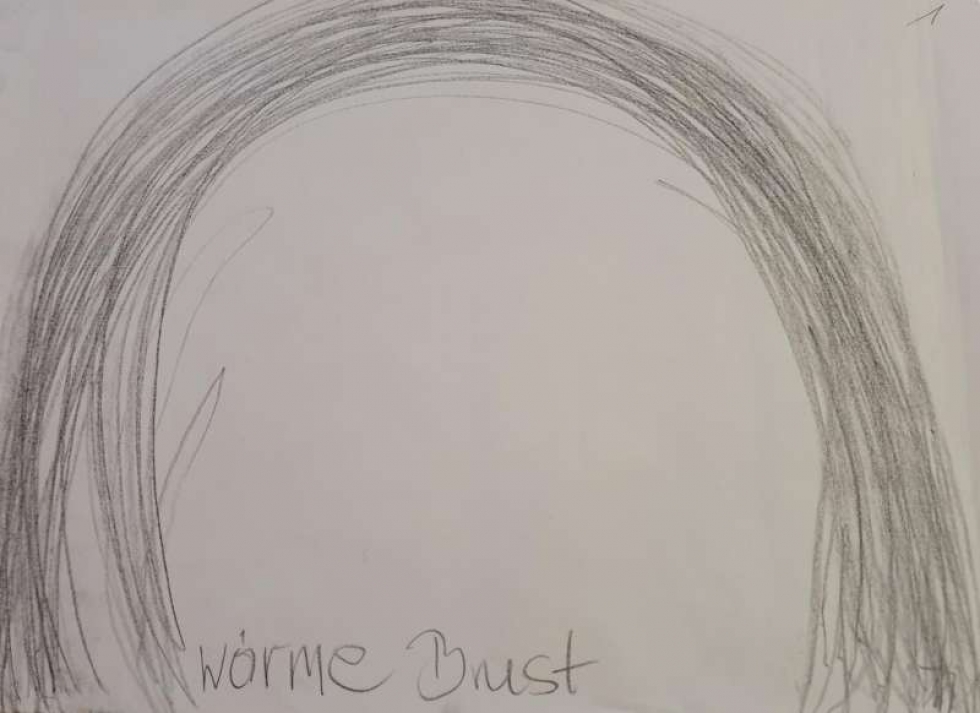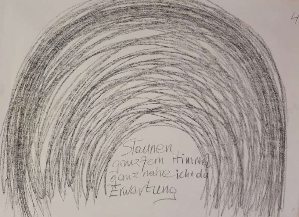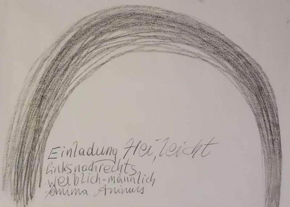 Beim Zeichnen der 1. Arkade wird Iris ganz warm und in ihr taucht das Bild der Brust auf. Die linke Hand führt Iris in ein leichtes, freies Gefühl, einer Einladung gleich. Im Schwingen von Links nach Rechts assoziert sie einen weiblich-männlichen Seelendialog zwischen Anima und Animus. Ganz anders das Empfinden mit der rechten Hand: Iris spürt wie müde sie ist vom inneren Getrieben sein und möchte im Grunde verweilen, an den beiden Punkten, wo die Linie die Erde berührt, möchte sich abgeben, Last ablegen, kein schwingend leichtes Aufschwingen wie mit der linken Hand. Mit beiden Händen im letzen Blatt empfindet Iris ein Staunen, der Himmel wird weit und fern und ganz nahe kommt sie sich selbst im Dialog von Ich und Du, von weiblich und männlich, ein Stimmung von Erwartung breitet sich in ihr aus.