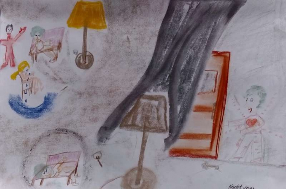 Die Traumarbeit ergänzte die Arbeit mit dem GZ und der Leibarbeit auf schöpferische Weise. Beim selbstständigen Malen der Träume in der Werkstatt, zu der ich Iris aufgefordert hatte, konnte Iris gut mit sich selbst in stimmiger Berührung und Zuwendung sein.
