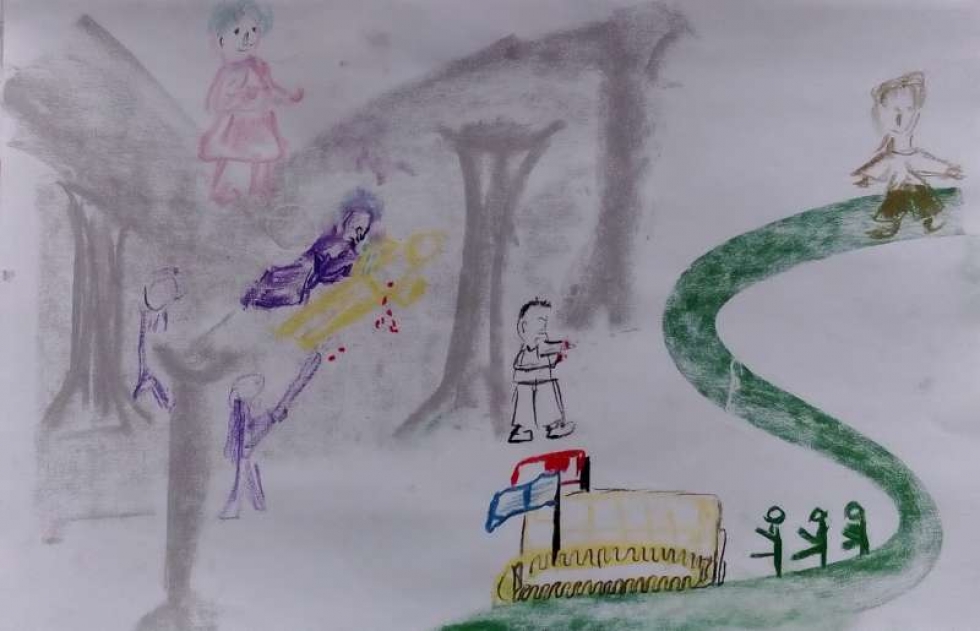 Im dritten Traum herrscht eine aggressive Atmosphäre. Zwei Männer sind Täter, ein Mann das Opfer. Iris setzt die Szene in einen von vier Säulen umstandenen Ort. Der attackierte Mann liegt, in leuchtendes Gelb gezeichnet, blutend am Boden, die violette weibliche Gestalt beugt sich klagend über ihn. Das Traumich ist zugleich involviert und gleichzeitig schaut es der Szene rosa gezeichnet zu. Auf dem Bild steht das Traumich rechts oben auf der Anhöhe, davor schlängelt sich grün die Straße von oben nach unten. Der Panzer fährt geflaggt mit den hinter ihm schreitenden Soldaten von rechts nach links.