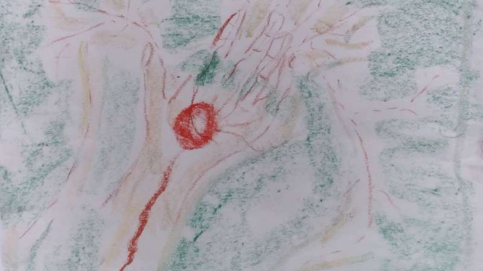 Nach dem Gespräch über den Traum und die daraus aufkommenden Gefühle und Gedanken wendet sich Iris dem leeren Blatt auf dem Tisch zu, berührt es mit geschlossenen Augen, mit beiden Händen, dann mit Kreidestiften in beiden Händen.