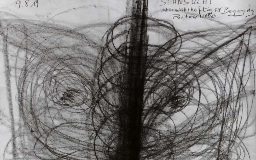 Im Kontakt mit dem Papier hat die linke Hand zum ersten Mal bewusst Gelegenheit zu tasten, zu spüren, sich einzubringen und auszudrücken. Gemeinsam mit der rechten Hand entstehen spontan großzügige schwingende öffnende Bewegungen. Sie entsprechen Iris Sehnsucht, und diese Sehnsucht darf gefühlt und ausgedrückt werden, darf Raum nehmen und sichtbar werden im Hier und Jetzt. Es entsteht eine starke Mittelachse, um die herum sich eine Spiralbewegung von oben nach unten bewegt. Spiralen bewegen sich auch in der linken und rechten Blatthälfte und ergeben zwei Mittelpunkte, die auf den Betrachter wie zwei Augen wirken, die ihn anblicken.